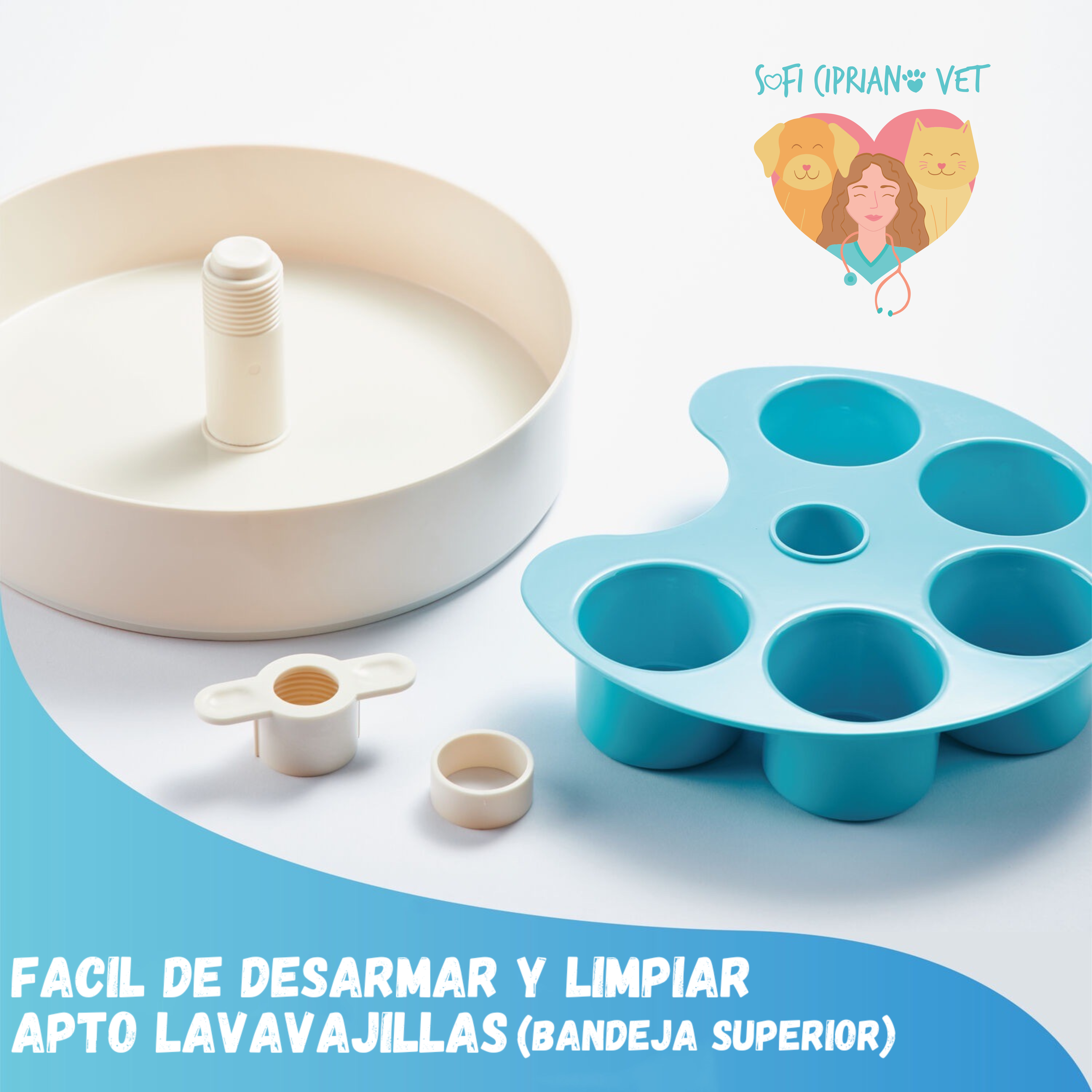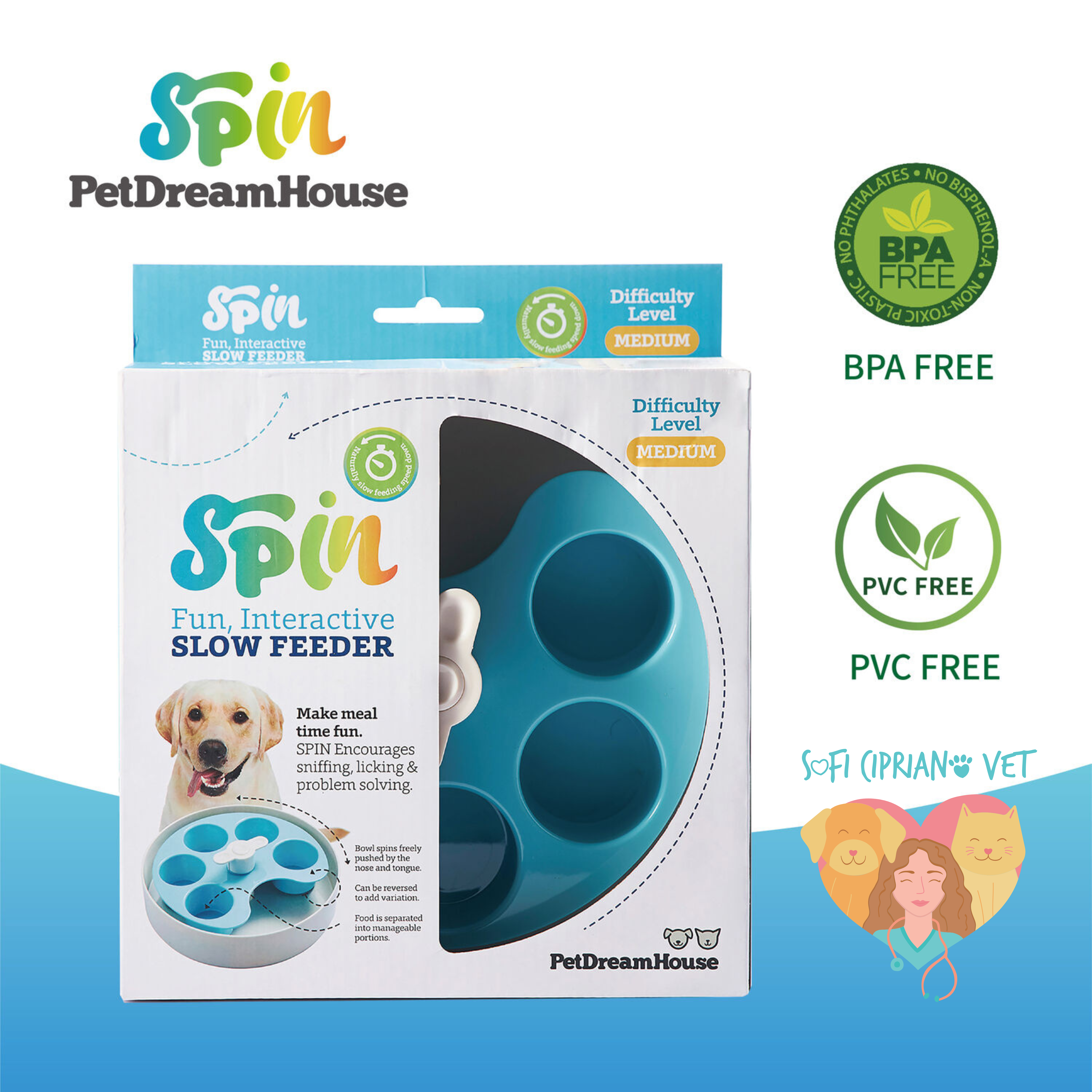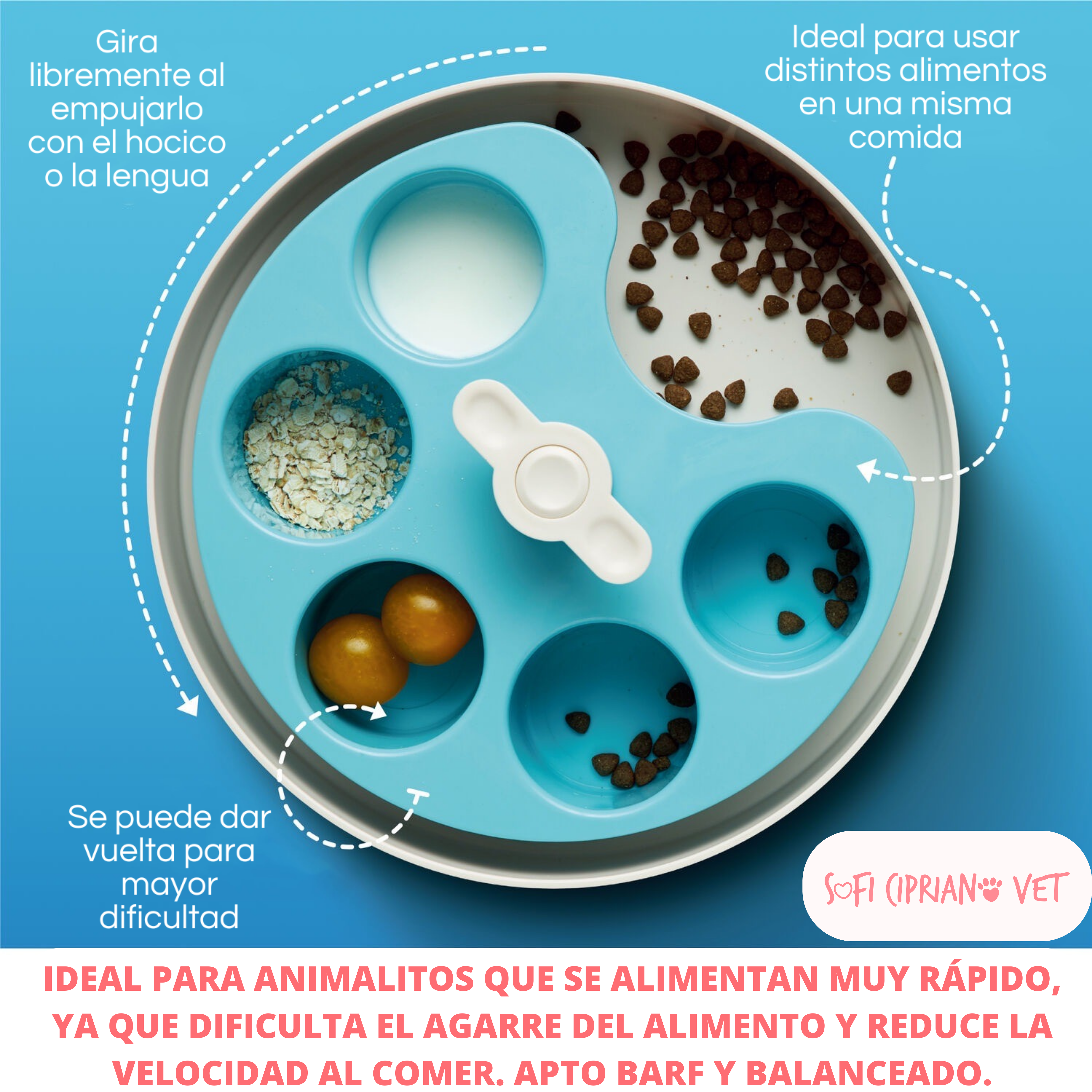 Los tazones SPIN alientan a olfatear, lamer y resolver problemas durante las comidas, lo que naturalmente ralentiza el comer y evita la asfixia, la hinchazón y el comer excesivamente rápido. Cada tazón tiene un elemento de rompecabezas central multifuncional que se puede ajustar en altura para ofrecer variación o voltearlo para crear una opción completamente nueva. Cada cuenco tiene cuatro grandes anillos antideslizantes para proporcionar una gran estabilidad y una ventoza para aumentar la fijacion al piso.